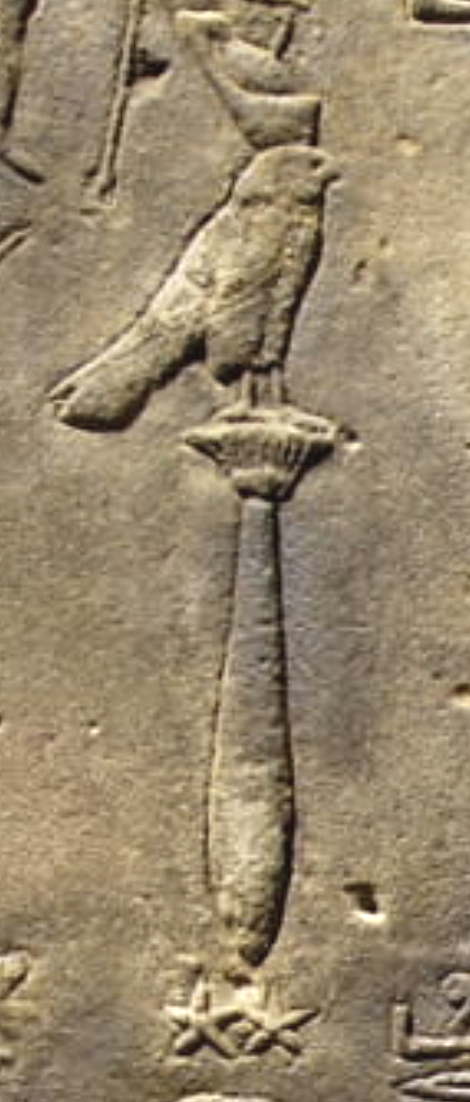 The carving of Horus on the inner night sky ring on the right side is a carving of the God standing on top of what scholars have termed as 'a sword' but clearly isn't. Below the 'sword' object are two stars which represent The Moon and The Earth, which are on the Decan ring, showing that this alignment carving is used for both the planet and its moon when extracting the numerical data from the system. This carving is necessary so that the required precision in the GM value can be specified in the sculpture.