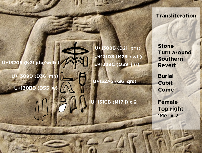 The first phrase tells you the instructions of how to perform the rotation, in reverse. The second phrase tells you to 'walk by a cubit to the burial', or rotate by one cubit to the final point and the third phrase is the hieroglyphs for 'female me', the 'me' word being repeated two times, along with a tear drop pointer, which is filled in white on the image. This third phrase tells you to align the final rotation to the eastern standing Goddess located at the top right of the carving.