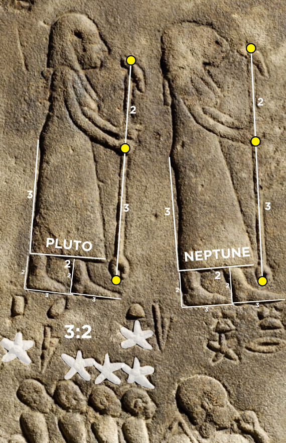 The orbits of the planets Neptune and Pluto are linked together in space by an orbital resonance where for every three orbits that Neptune completes, Pluto completes exactly two. This is why the two Gods representing these two planets are following each other closely as a pair of Gods on the Dendera Zodiac sculpture allowing Pluto to be identified. Illustration 5 shows the two planet Gods with the stars below the Pluto God showing the 3:2 resonance of the planet's orbit periods and the overall design of the carving being full of 3:2 ratios.
